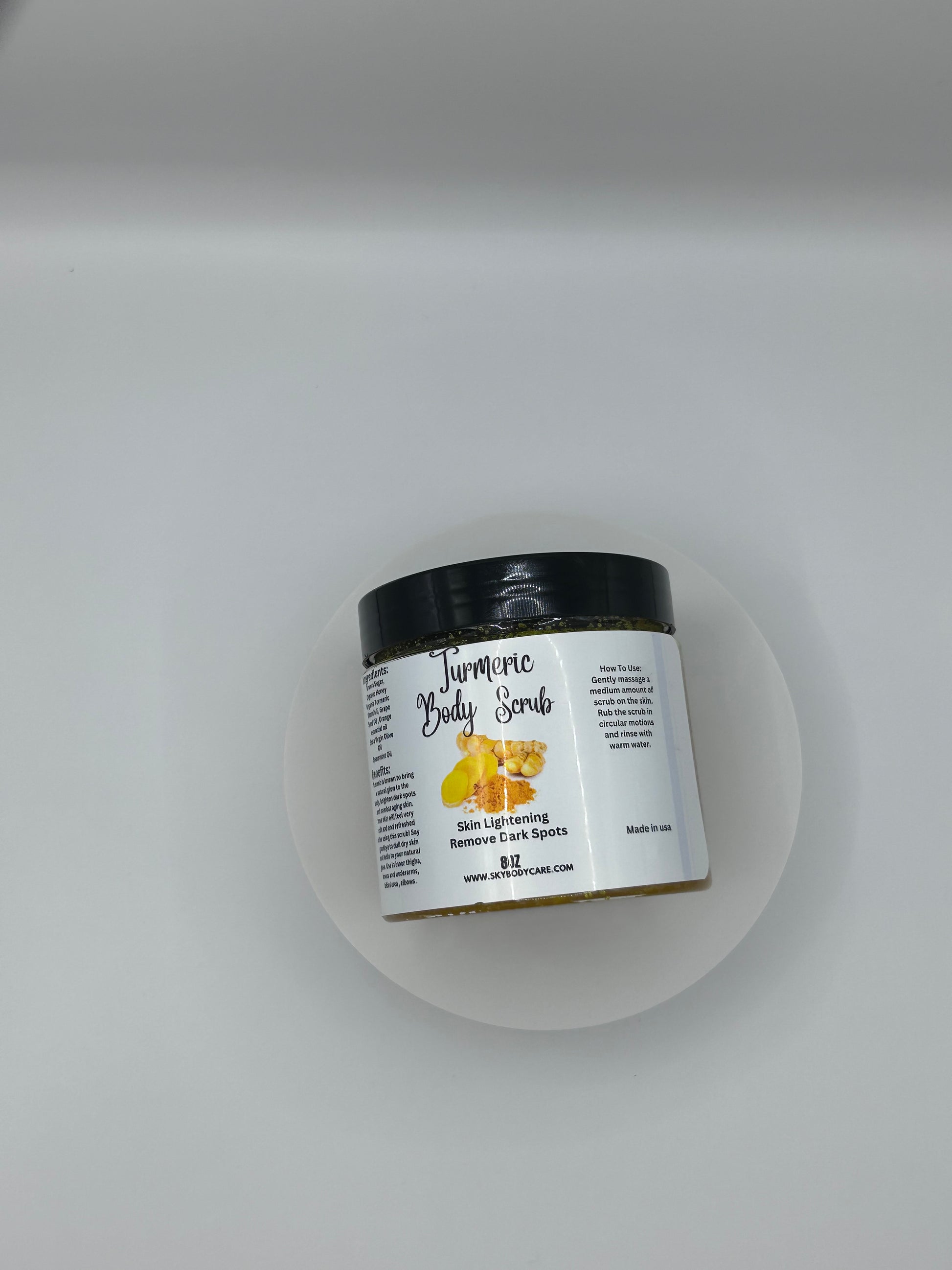 Benefits of Turmeric Body Scrub: Sloughs off dead skin cells, Leave skin super smooth and soft, Prevents acne and Blemishes, Erases scars and dark spots, Helps with cellulite, Fixes uneven skin tone and Exfoliates and much more. ( Use on face and body)